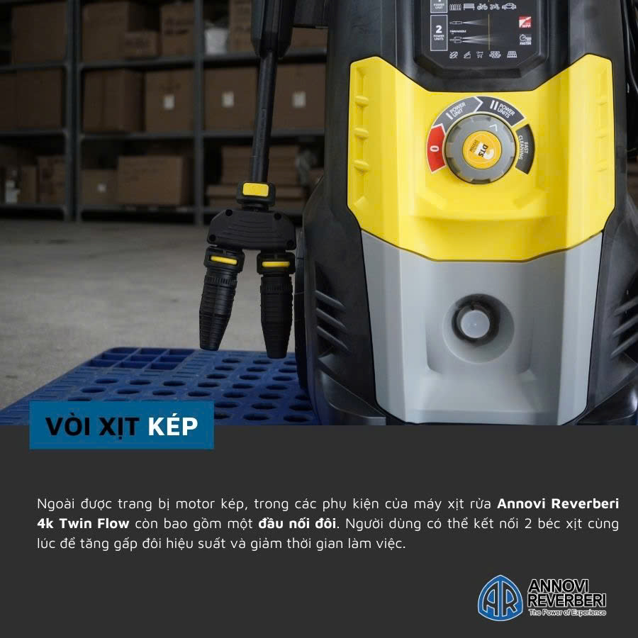 Twin Nozzle – tính năng đầu xịt kép, đây là một tính năng mới được bổ sung vào dòng Máy xịt rửa chuyên dụng Annovi Reverberi 4K TWIN FLOW – 2 động cơ, áp lực cao 150bar, 2500W nó giúp người dùng vệ sinh nhanh hơn, xử lý công việc thuận lợi, và phạm vi xử lý rộng.
