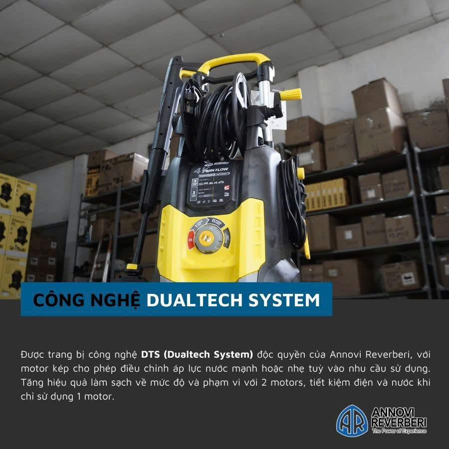 Máy xịt rửa chuyên dụng Annovi Reverberi 4K TWIN FLOW – motor kép, áp lực cao 150bar, 2500W được trang bị công nghệ DTS Dualtech System độc quyền của Annovi Reverberi – máy được trang bị 2 motor riêng biệt sử dụng độc lập. Người dùng hoàn toàn chủ động điều chỉnh sử dụng một motor cho các công việc nhẹ nhàng, vệ sinh nhà cửa với độ áp lực nước 90-100 bar… trong trường hợp cần sử dụng công suất cao hơn, áp lực xịt lớn hơn lên đến 150bar thì người dùng có thể điều chỉnh sử dụng hai motor cùng một lúc. Công nghệ DualTech System giúp người dùng tiết kiệm điện năng, nước và hoàn toàn có thể điều chỉnh áp lực khi cần sử dụng cho các công việc cần tầng suất cao, vệ sinh công nghiệp nặng…