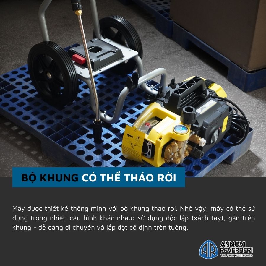 - Giá đỡ đựng súng xịt tiện lợi, tay cầm thuận tiện và 2 bánh xe vỏ cao su giúp dễ dàng di chuyển máy.